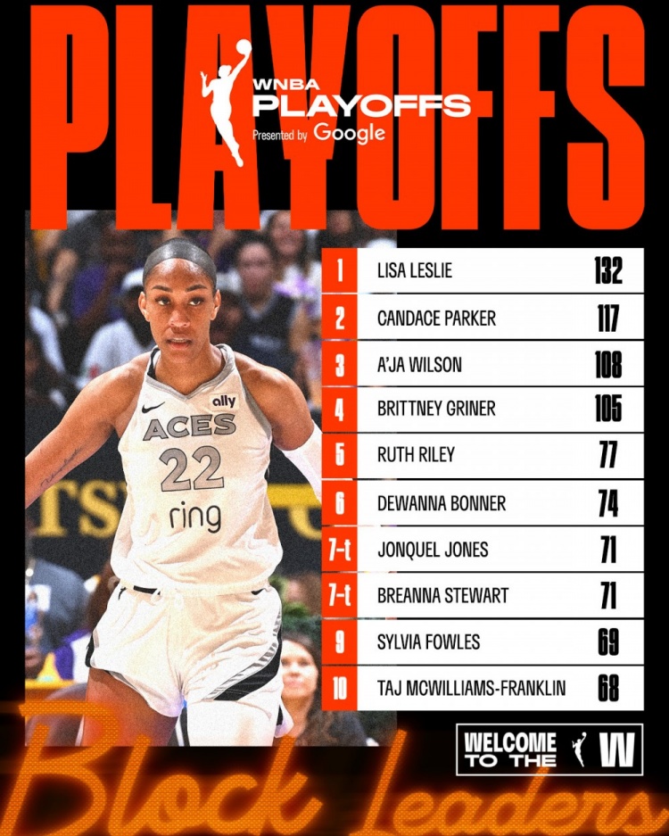 據(jù)統(tǒng)計(jì),本場(chǎng)過(guò)后阿賈-威爾遜在季后賽蓋帽數(shù)來(lái)到108個(gè),她也超越格里娜,獨(dú)居WNBA歷史第3位。在她身前是坎迪斯-帕克的117次和麗莎-萊斯莉的132次。