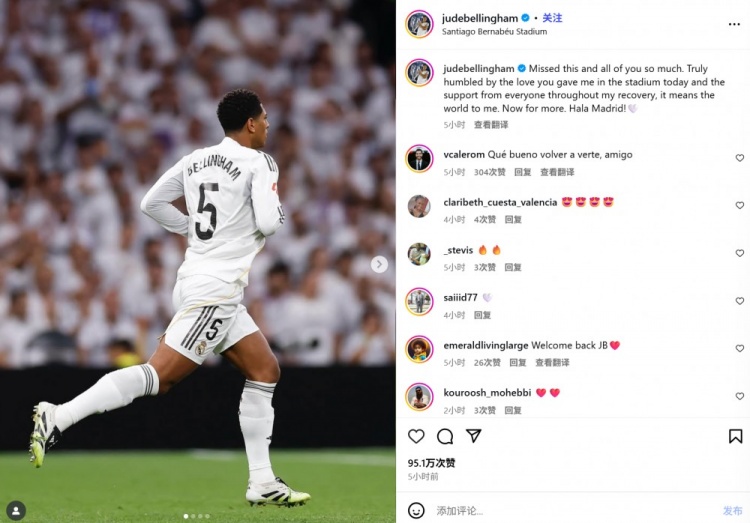 他也在賽后通過社媒曬出自己的比賽照,并配文:“深切想念這一切和你們每個(gè)人。今日球場給予的愛、以及康復(fù)期間各界的支持令我深受感動,這對我意味著全世界。征程此刻重啟。皇馬加油!”