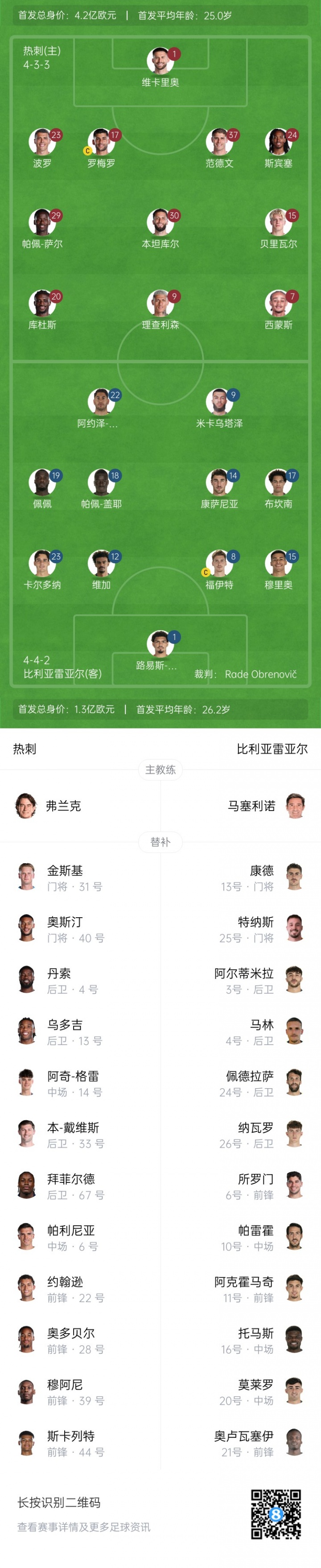 熱刺方面,新援哈維-西蒙斯首發(fā)與理查利森、庫杜斯搭檔鋒線,穆阿尼則替補待命。黃潛方面,新援維加、米卡烏塔澤先發(fā),前槍手中場托馬斯替補。
