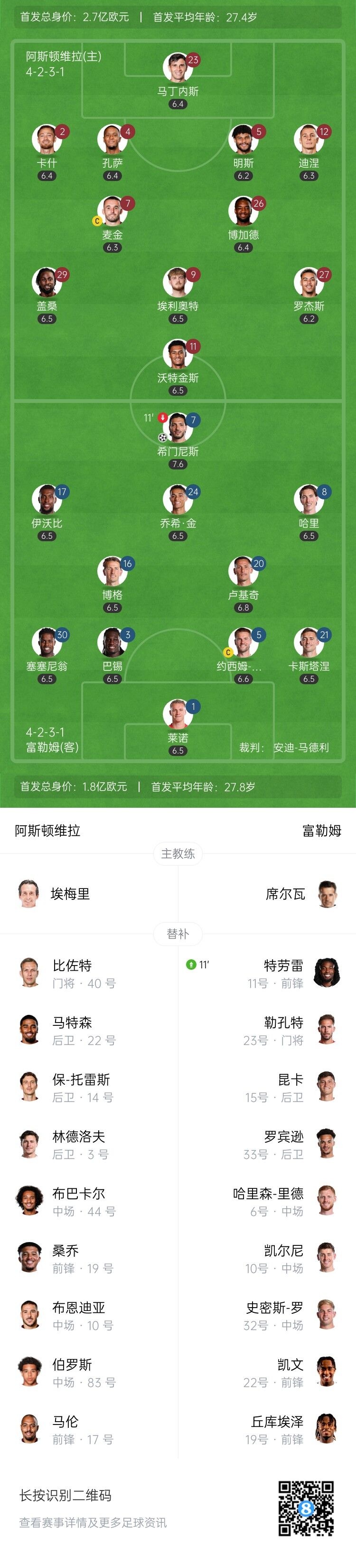 9月28日訊 北京時(shí)間9月28日晚上21:00,英超第6輪,阿斯頓維拉坐鎮(zhèn)維拉公園球場(chǎng)迎戰(zhàn)富勒姆。上半場(chǎng),希門尼斯3分鐘破門,明斯傷退,馬丁內(nèi)斯化解單刀,沃特金斯挑射扳平。半場(chǎng)戰(zhàn)罷,阿斯頓維拉1-1富勒姆。