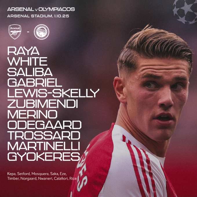 阿森納vs紐卡首發(fā):1-拉亞、3-莫斯克拉、6-加布里埃爾、12-廷伯、33-卡拉菲奧里、36-蘇維門迪、41-賴斯、10-埃澤、7-薩卡、14-約克雷斯、19-特羅薩德
