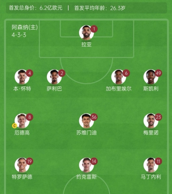 阿森納vs奧林匹亞科斯首發(fā):1-拉亞、2-薩利巴、4-本·懷特、6-加布里埃爾、49-斯凱利、8-厄德高、36-蘇維門迪、23-梅里諾、11-馬丁內(nèi)利、19-特羅薩德、14-約克雷斯