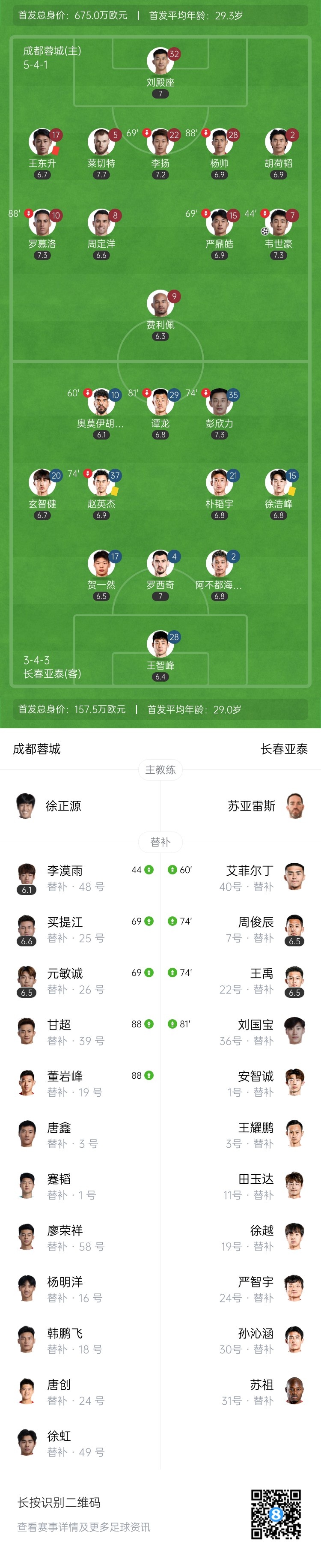 下半場(chǎng)補(bǔ)時(shí)6分鐘。最終全場(chǎng)比賽結(jié)束,成都蓉城1-0長(zhǎng)春亞泰。